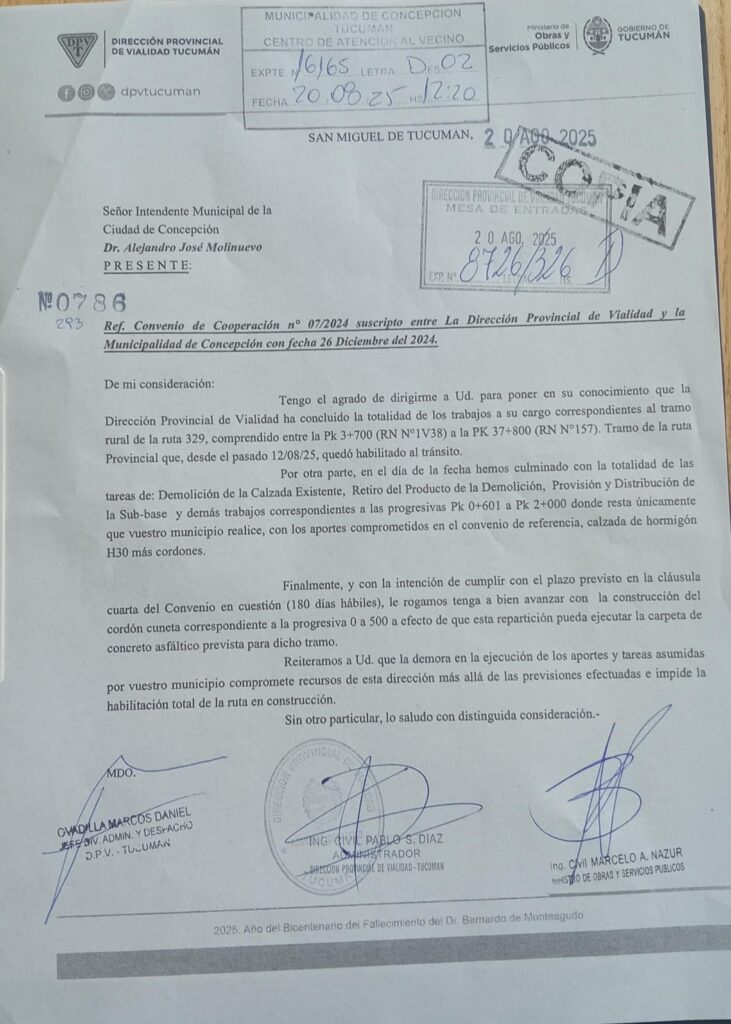 Por medio de una nota formal presentada ante la Municipalidad de Concepción, el Ministerio de Obras y Servicios Públicos de Tucumán y la Dirección Provincial de Vialidad (DPV) peticionaron al Ejecutivo de la ciudad del sur provincial que cumpla con su parte del convenio de cooperación y avance con la obra en la ruta 329 para poder terminar la carpeta asfáltica en tiempo y forma. En el escrito, el organismo provincial solicita a la municipalidad concepcionense que concluya las tareas de cordón cuneta para poder continuar con los trabajos.