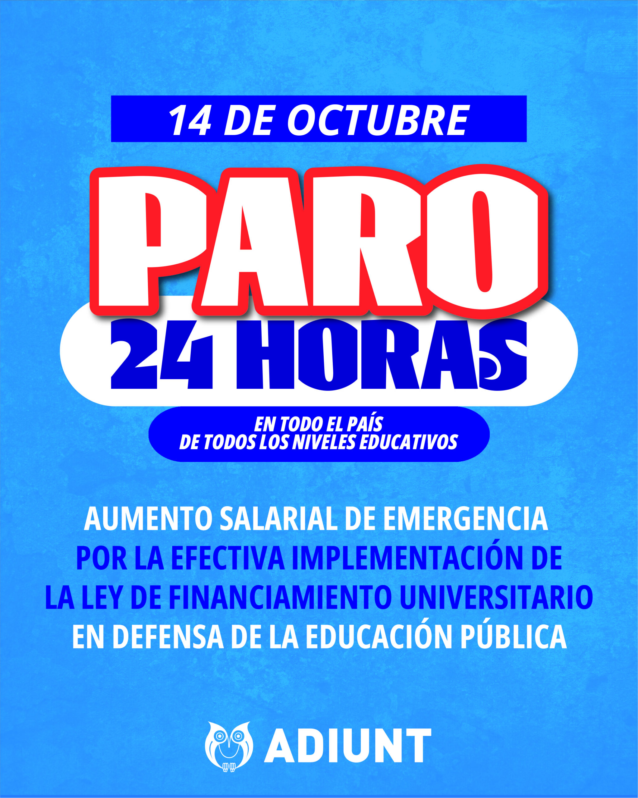 La ADIUNT adhiere al paro nacional docente de 24 horas convocado por CTERA para el próximo martes 14 de octubre, en reclamo de un aumento salarial de emergencia, la reapertura de las paritarias y la efectiva implementación de la Ley de Financiamiento Universitario.