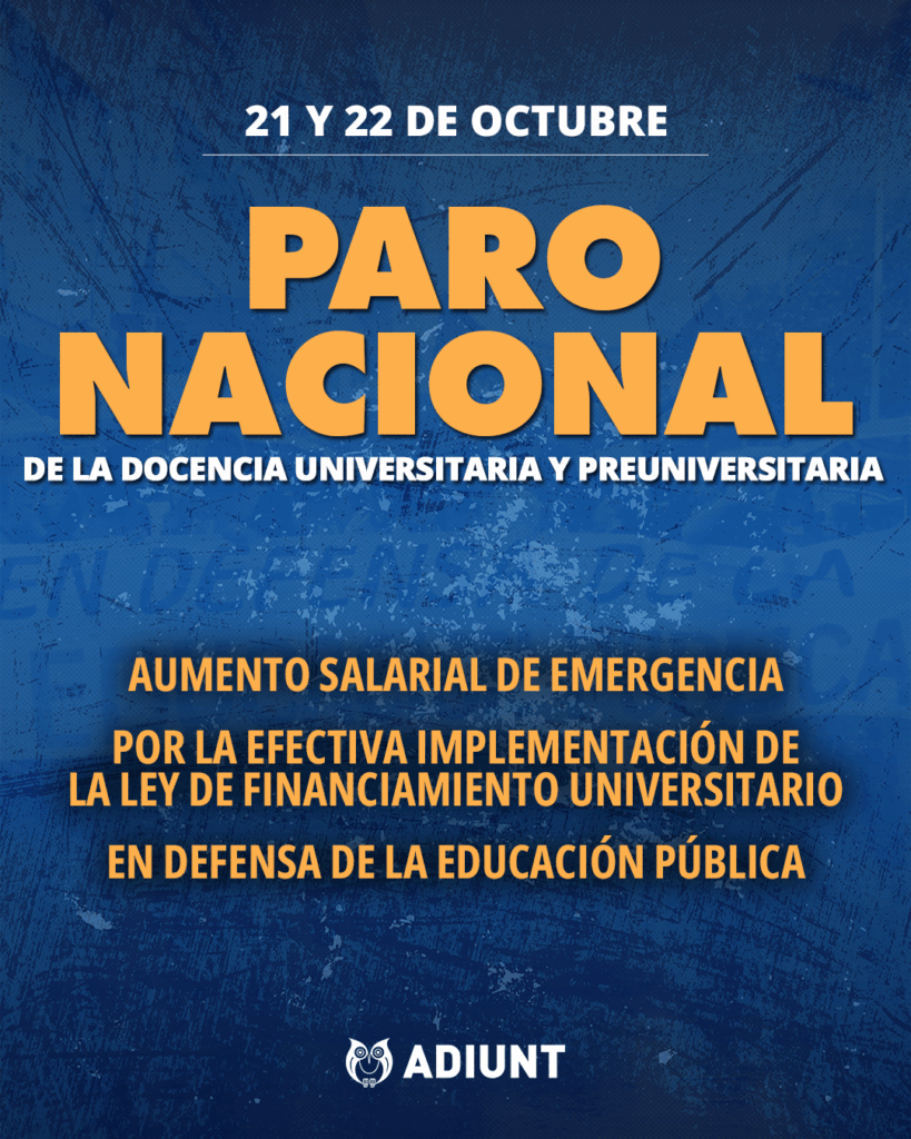 La docencia universitaria y preuniversitaria de todo el país llevará adelante un Paro Nacional los días 21 y 22 de octubre, en reclamo de respuestas urgentes ante la crisis salarial y presupuestaria que atraviesa el sistema universitario público.