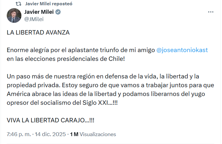 El presidente argentino celebró el triunfo del líder del Partido Republicano en el balotaje chileno y expresó su expectativa de trabajar en conjunto para fortalecer una agenda regional basada en la libertad, la vida y la propiedad privada.