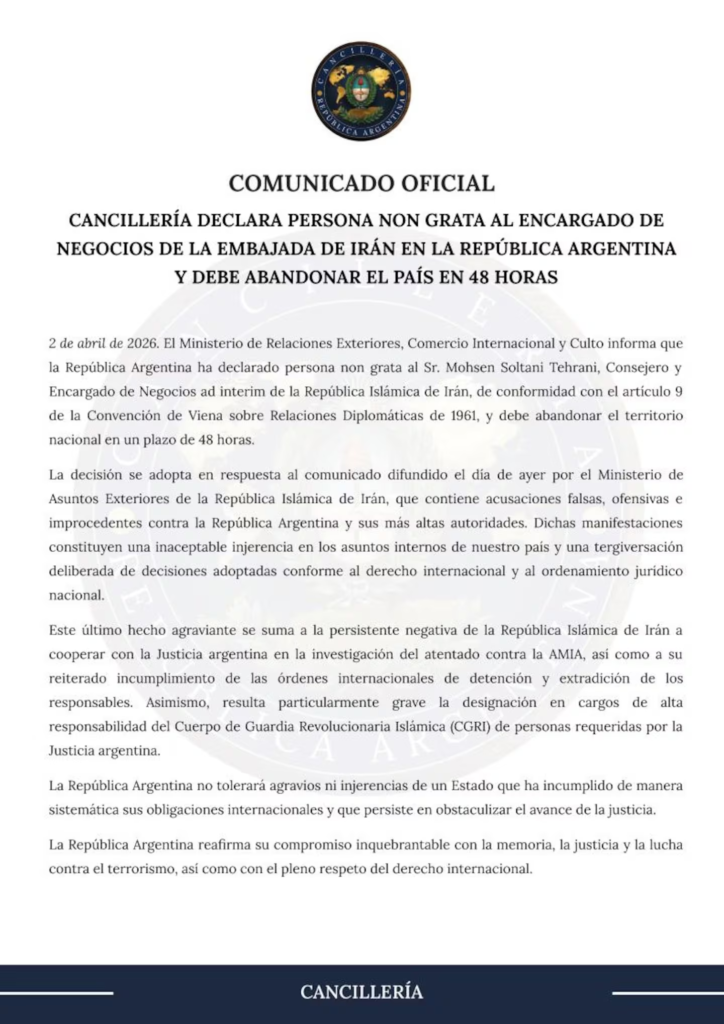La medida fue comunicada por la Cancillería encabezada por Pablo Quirno, que argumentó que la determinación responde a recientes declaraciones del gobierno iraní consideradas agraviantes hacia la Argentina y sus autoridades. En ese sentido, se fijó un plazo de 48 horas para que el diplomático abandone el territorio.