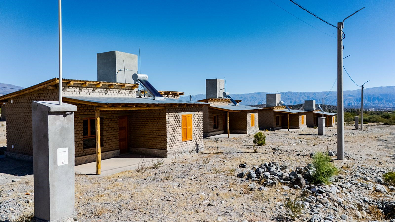 Uno de los aspectos más destacados del proyecto es su enfoque ambiental. Las viviendas fueron construidas con materiales autóctonos como adobe, piedra, madera y lajas, incorporando además tecnologías como termotanques solares y biodigestores individuales, lo que permite optimizar el consumo energético y reducir el impacto ambiental.